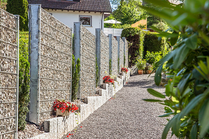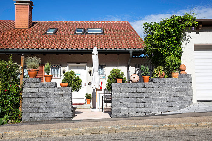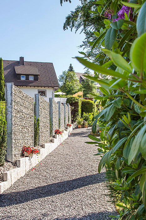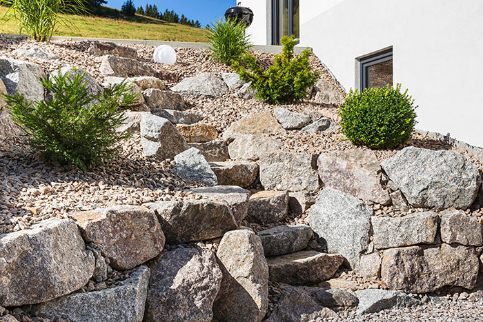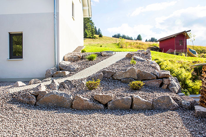 Private Aussenanlage Schotterwände – Natursteinplattenverlegung