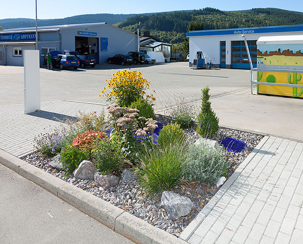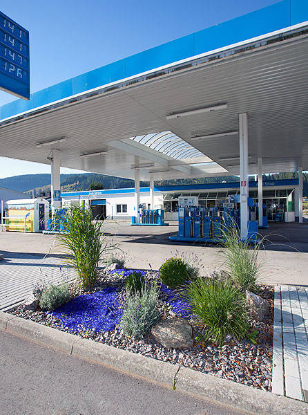 Tankstelle: Schotterbeet mit Glassplit